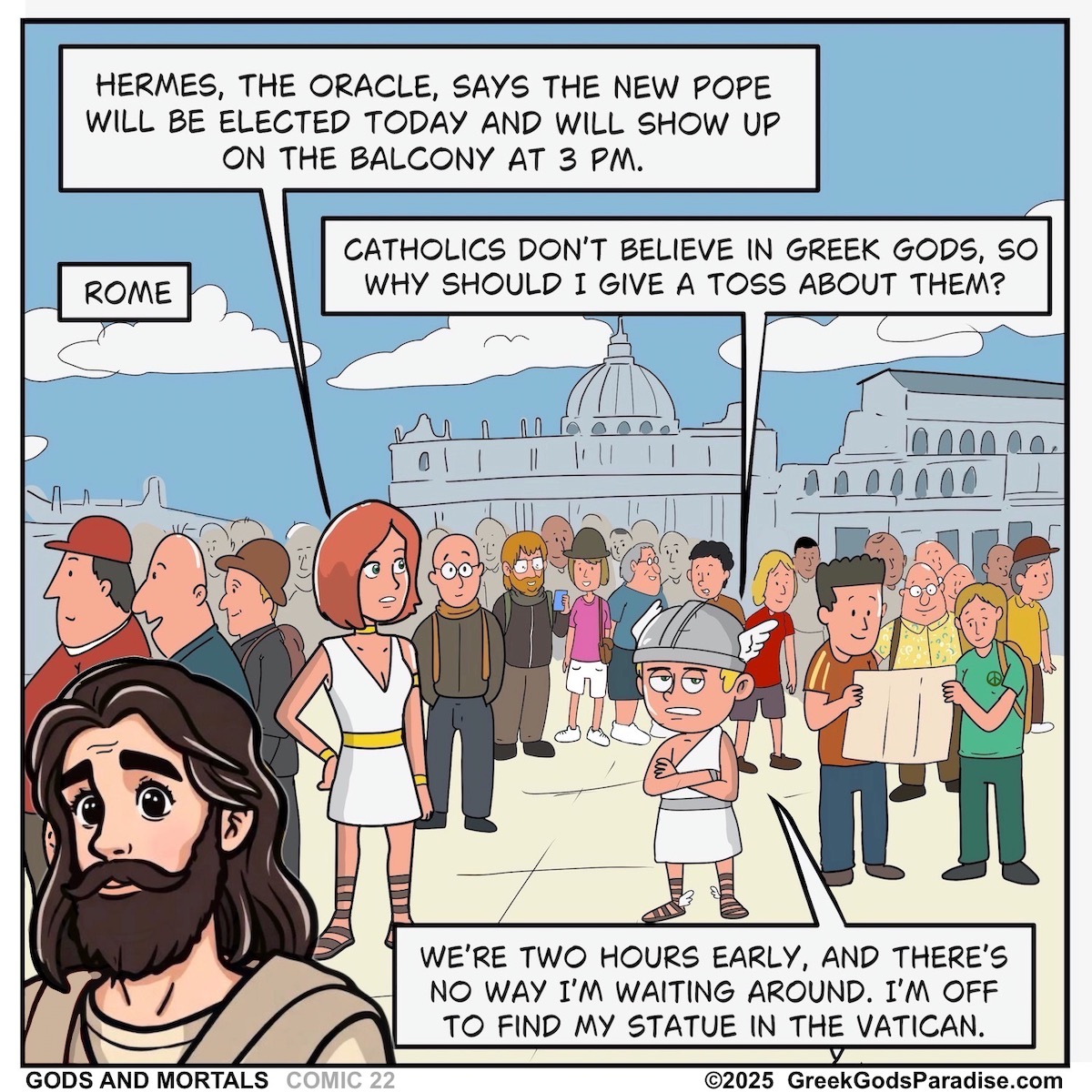 As you can see, the Greek gods show up in Rome right when they’re picking a new Pope. Not sure what year this is supposed to be, but who cares? Basically, the gods crash the Vatican election and turn the whole thing into one crazy Catholic Pope comic…