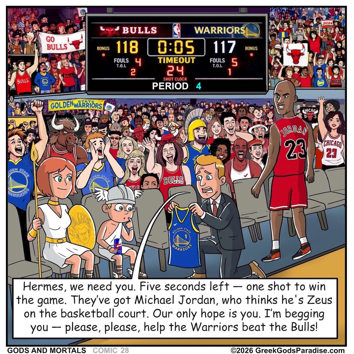 So there you have it — history’s most epic basketball showdown in comic form: Hermes vs. Michael Jordan, featuring the Chicago Bulls’ finest, a divine Greek god, and a slam dunk that probably blew your mind…